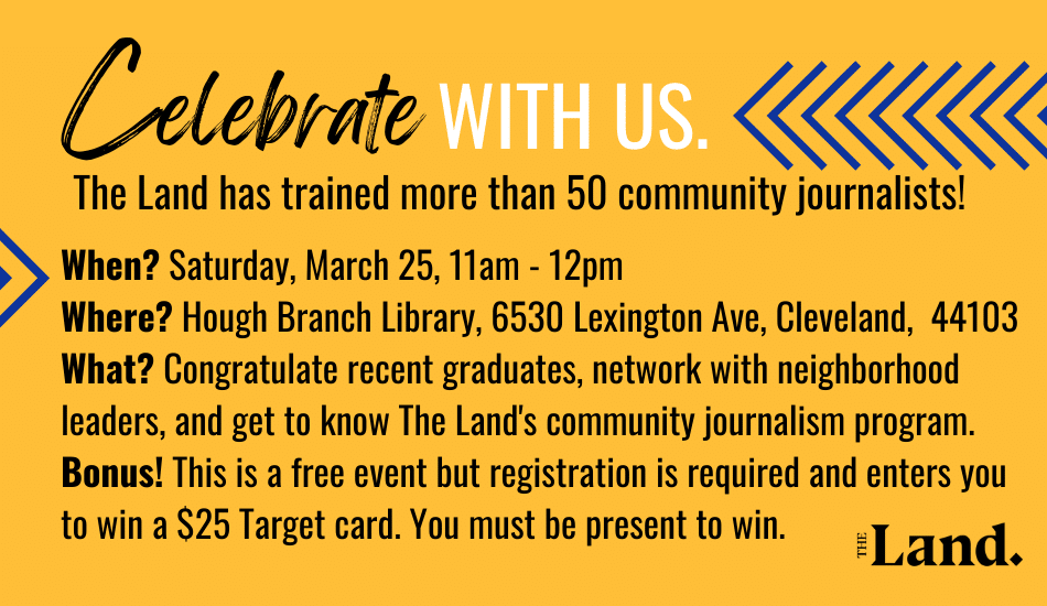Hough Branch Library 6530 Lexington Avenue, Cleveland, OHThe Land has been working to increase community journalism skills so residents can report from where they live. Since we started the program, Reporting From Where We Live, in 2021, we have trained more than 50 residents to tell stories from their neighborhoods on the digital pages of thelandcle.org. To celebrate the graduation of a new cohort and this amazing milestone, we invite you to celebrate with us! On Saturday, March 25, 11am - 12pm, we will meet at the beautiful new Hough Branch Library at 6530 Lexington Ave, Cleveland, 44103 to congratulate recent graduates, network with neighborhood leaders, and get to know The Land's community journalists better. Featured guests Sharon Core, a resident of Slavic Village, will introduce and read from her article Sidaway Bridge nominated for landmark status, raising hopes for redevelopment and green space. Charlotte Morgan, the creator of the Reporting from Where We Live course, will introduce The Land's community journalism program and host the event. Moses Ngong, a Detroit Shoreway resident, will introduce and read from his article Out Fitness Collective offers affirming, inclusive workout space for LGBTQ+, allied community. La Queta Worley, representing the Central community wherever she goes, will introduce […]