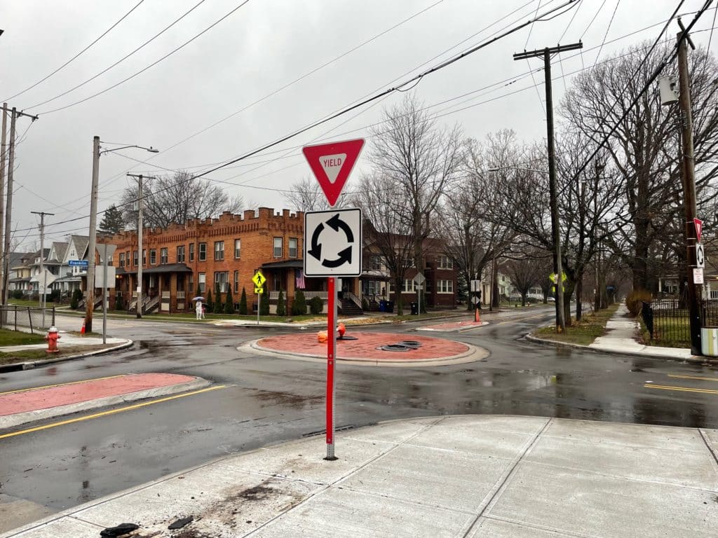 Roundabouts are relatively new to Cleveland, and these are really small. The city said that cars should slow down as they approach the intersection, yield to pedestrians, yield to vehicles in the roundabout (the person on the left has the right of way), and proceed to the right of the center island until reaching their exit. Mersmann said that crews will return in the spring to install the final details, including high visibility painted crosswalks, bicycle sharrows, raised reflective pavement markers around the mini roundabouts, and rectangular rapid flashing beacons at key crosswalks. Construction on the remainder of Franklin between W. 25th Street and W. 50th Street will kick off in the spring and be completed this year.