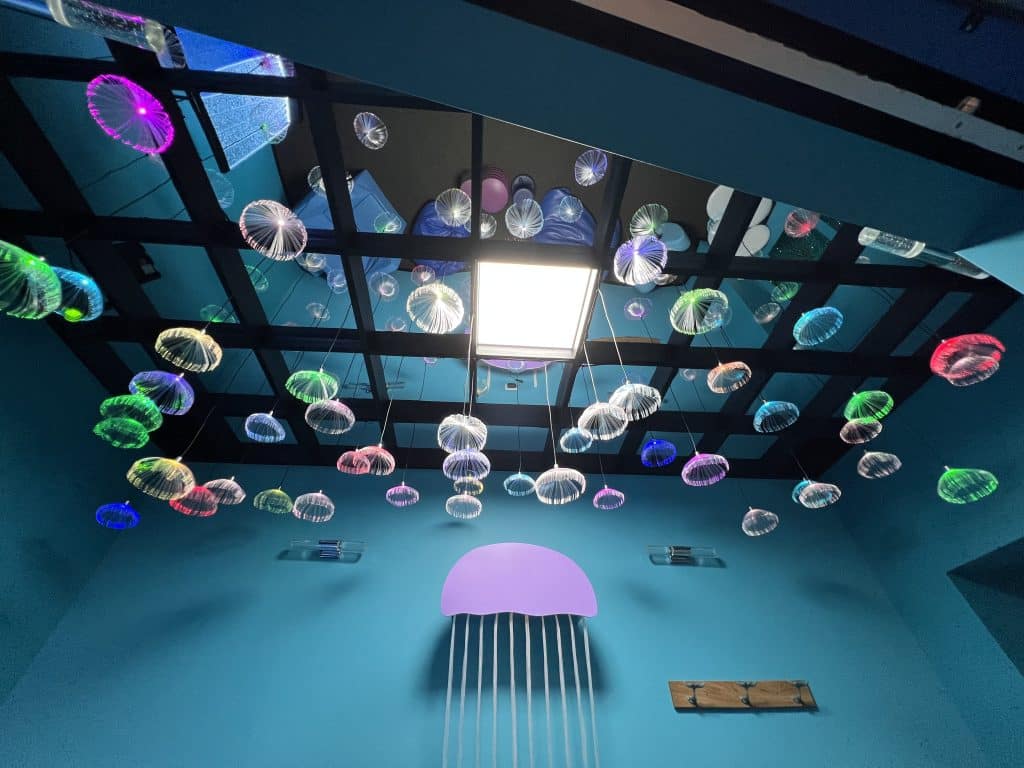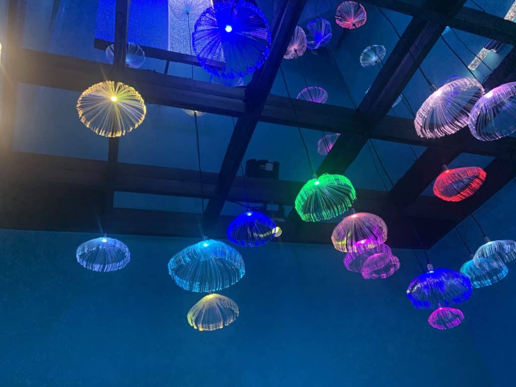 Bubbles lit by ever-changing colors ascend continually inside a “bubble wall” while “jellyfish” of various colors dangle from the ceiling. Plastic ropes with fiberoptic lights hang from another wall. Guests can step on liquid floor tiles that change colors when pressure is applied.