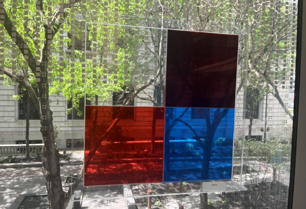 The colorful parts of the design, both blue and red, were made from the same amount of material, just cut differently. The final artwork illustrates that the two fractions (10/20 and 2/4) are equivalent. It’s a visual representation of those two equivalencies, she said.