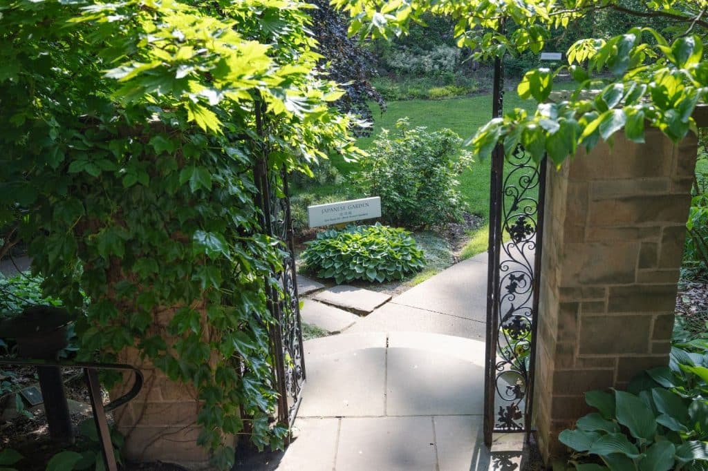 Signage at the garden reads, “In the 1970s, a young Clevelander’s appreciation for nature and unique design perspective brought him home to create a Japanese garden. David Slawson was just 34 years old and fresh from an apprenticeship in Kyoto when he was selected to design a Japanese garden for the Garden Center of Greater Cleveland. Now in its 50th year, the garden he named Gan Ryuu Tei has grown into its features, evoking the timeless, weathered beauty of famous landscapes in Japan while staying true to its Cleveland roots.”