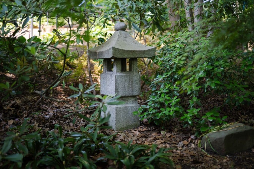 The name given to the garden by Slawson, “Gan Ryuu Tei” or “Rock Stream Garden” aptly reflects its character. Visitors enter through a gate, wander through meandering shaded paths on stone steps and over a bridge, feeling the humidity and listening to the sounds of the trickling water under the bridge. A water basin is presented for washing hands and face before evening tea ceremonies. Stone lanterns dot the path to light the way.