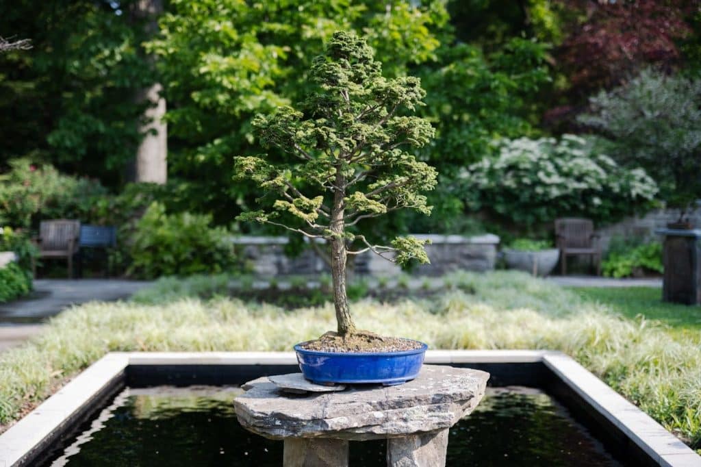 The bonsai from the Thesings’ personal collection is on display throughout the Restorative Garden, the largest of which is 35 to 40 years old and sits on a stone pedestal over the reflecting pool.