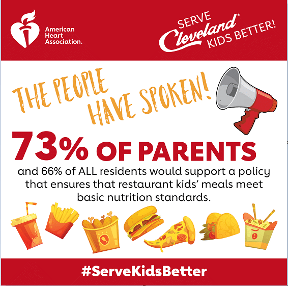 Why the focus on restaurant meals? “Twenty-five percent of kids get nutrition from restaurant meals,” explained James Meerdink, Community Advocacy Director, American Heart Association. “If you call something a kids’ meal in the City of Cleveland, that should mean healthy.”