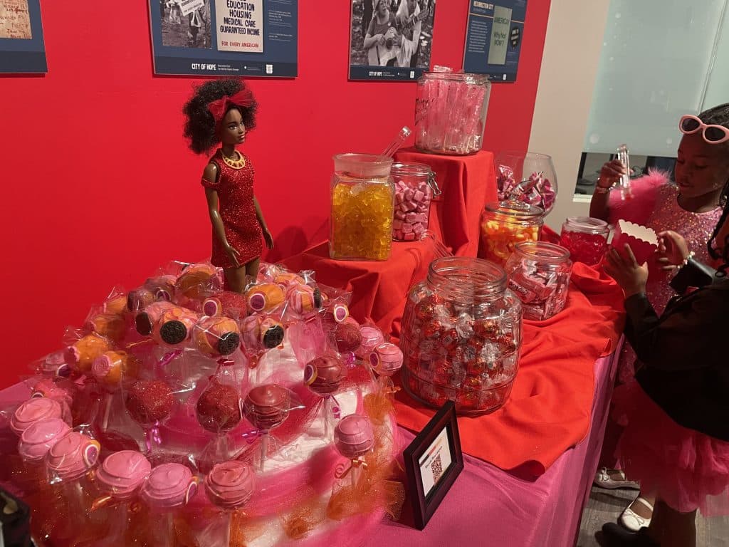 The screening was a fun and festive affair, complete with a beautifully decorated pink and red display table featuring popcorn, snacks, and candy surrounding a replica of the original Black Barbie from the film. Guests enjoyed two “Doll-icious Drinks” — a Sparkling Sunrise Mocktail and a Pomegranate Apple Cider Sparkler — served in cute plastic champagne flutes. An assortment of cheeses and crackers were laid out alongside decadent bite-sized cake pops from Nina Lau’Rens.