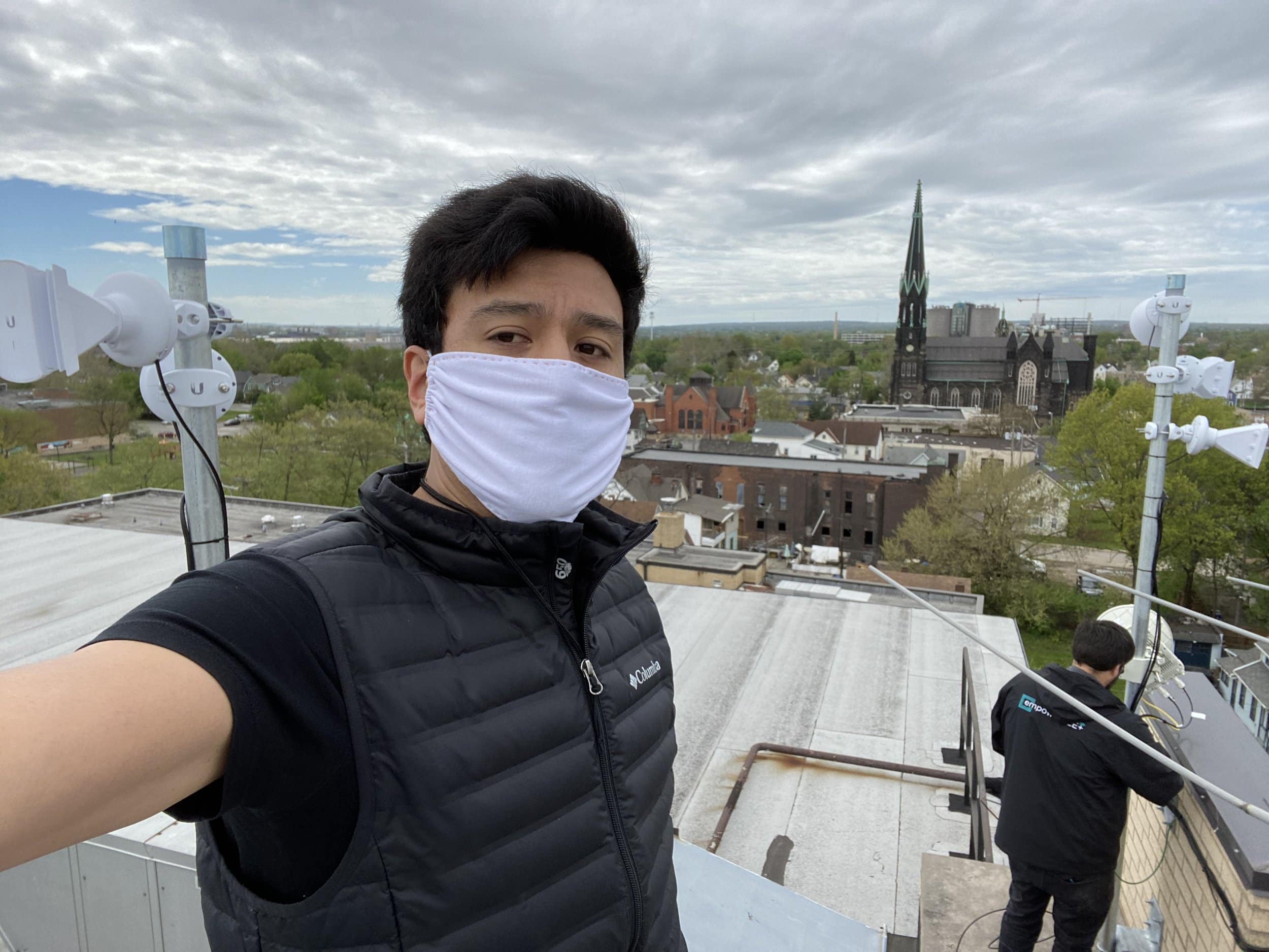 Rolando Alvarez installing radios atop Cuyahoga Metropolitan Housing Authority’s Scranton Castle building in Cleveland’s Clark-Fulton neighborhood.