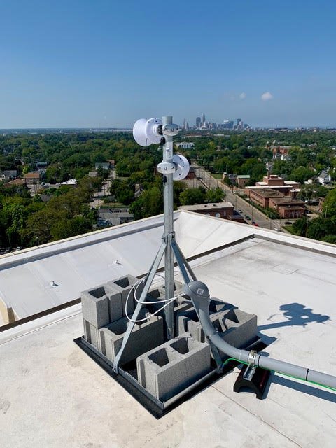 However, millimeter wave technology doesn’t penetrate buildings well and can be blocked by foliage. That’s a problem in Cleveland, the so-called “forest city.” Another option is to transmit the signal over citizen broadband radio services, a spectrum that the Federal Communications Commission (FCC) recently opened to non-military uses. Between these two technologies, DigitalC is able to offer consistent download speeds of 50 Mbps and upload speeds of 20 Mbps, Baunach said.