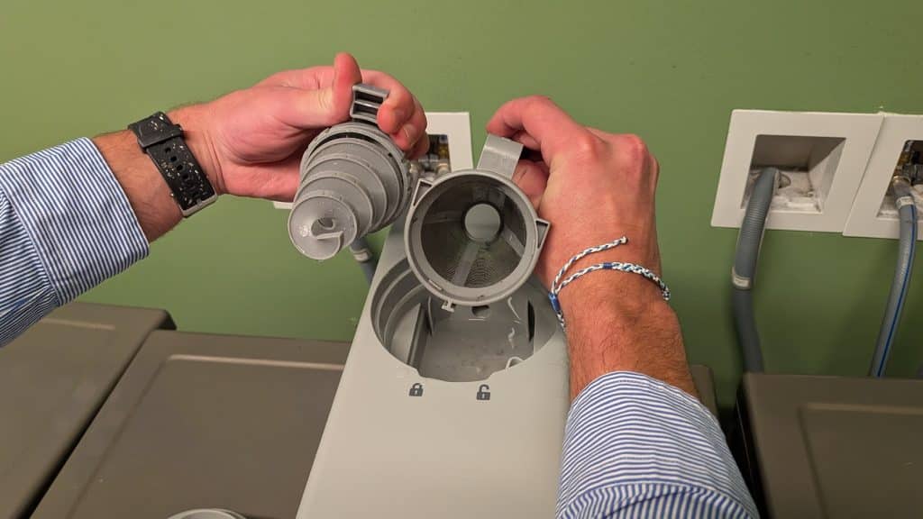 The company says the filter can be installed in under 15 minutes to any washer with room on top or nearby. The owner attaches an accompanying hose to a water outlet and the washer’s hose to the filter.