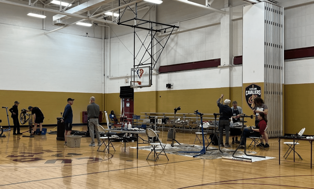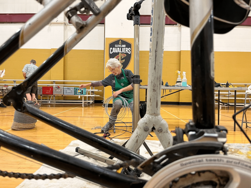While Bike Cleveland brought tables, chairs and helmets and generally pipelined visitors through the gymnaisum, the Ohio City Bicycle Co-Op (OCBC) was responsible for lugging in the volunteer labor force as well as the bike stands and components necessary for the event. Both stationed on Cleveland’s west side (founded in 2003 and 2010, respectively), the groups’ collective presence at the gym reminded some volunteers of OCBC’s and BC’s shared lineage while helping to further their missions as Cleveland’s premier bike nonprofits.