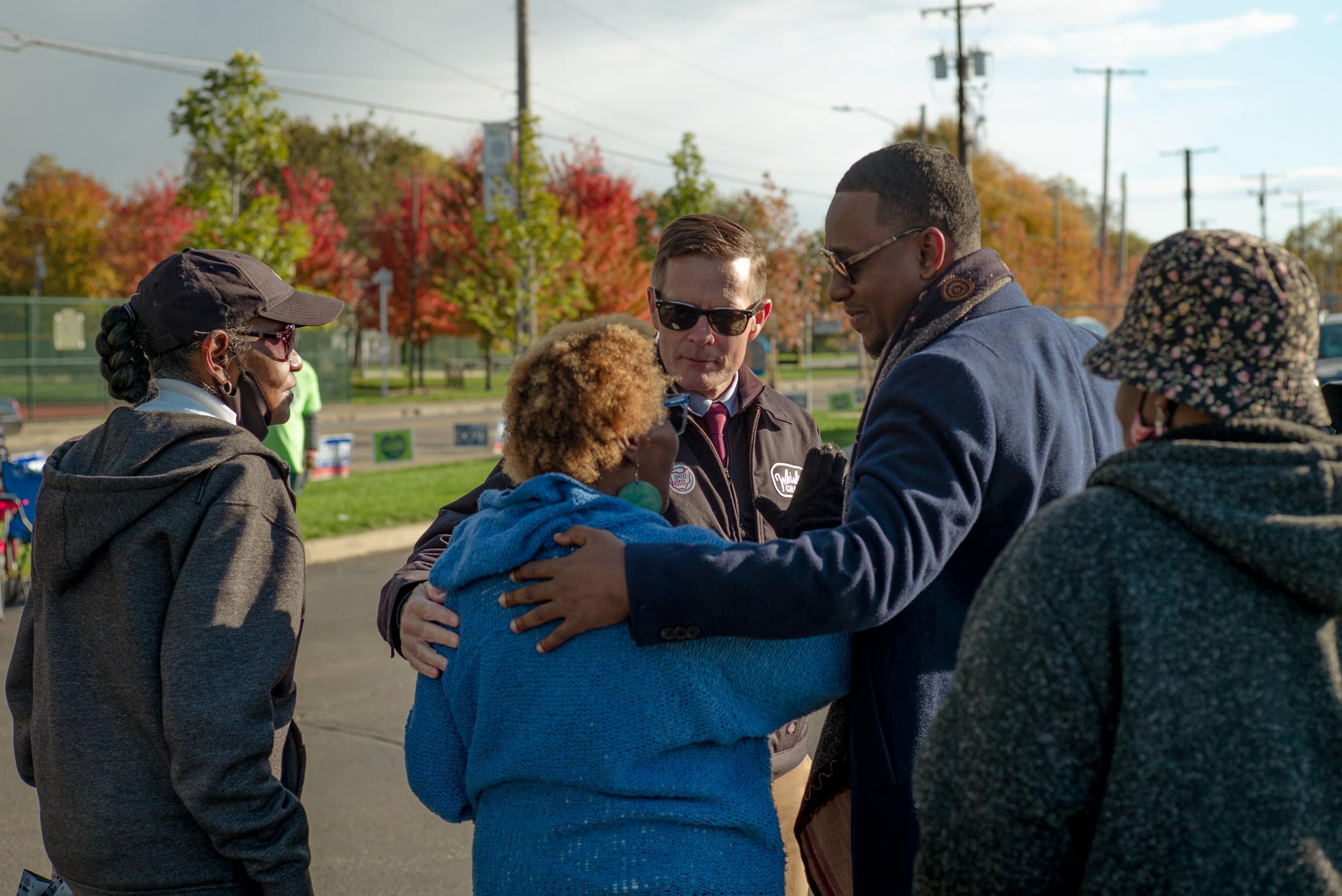 Mayoral Candidate Kevin Kelley and his campaigners greet Ward 7 city council member Basheer Jones, who endorsed Kelley, at the Fatima Family Center polling station in Hough on General Election Day on Tuesday, Nov. 2, 2021. Photo by Michael Indriolo