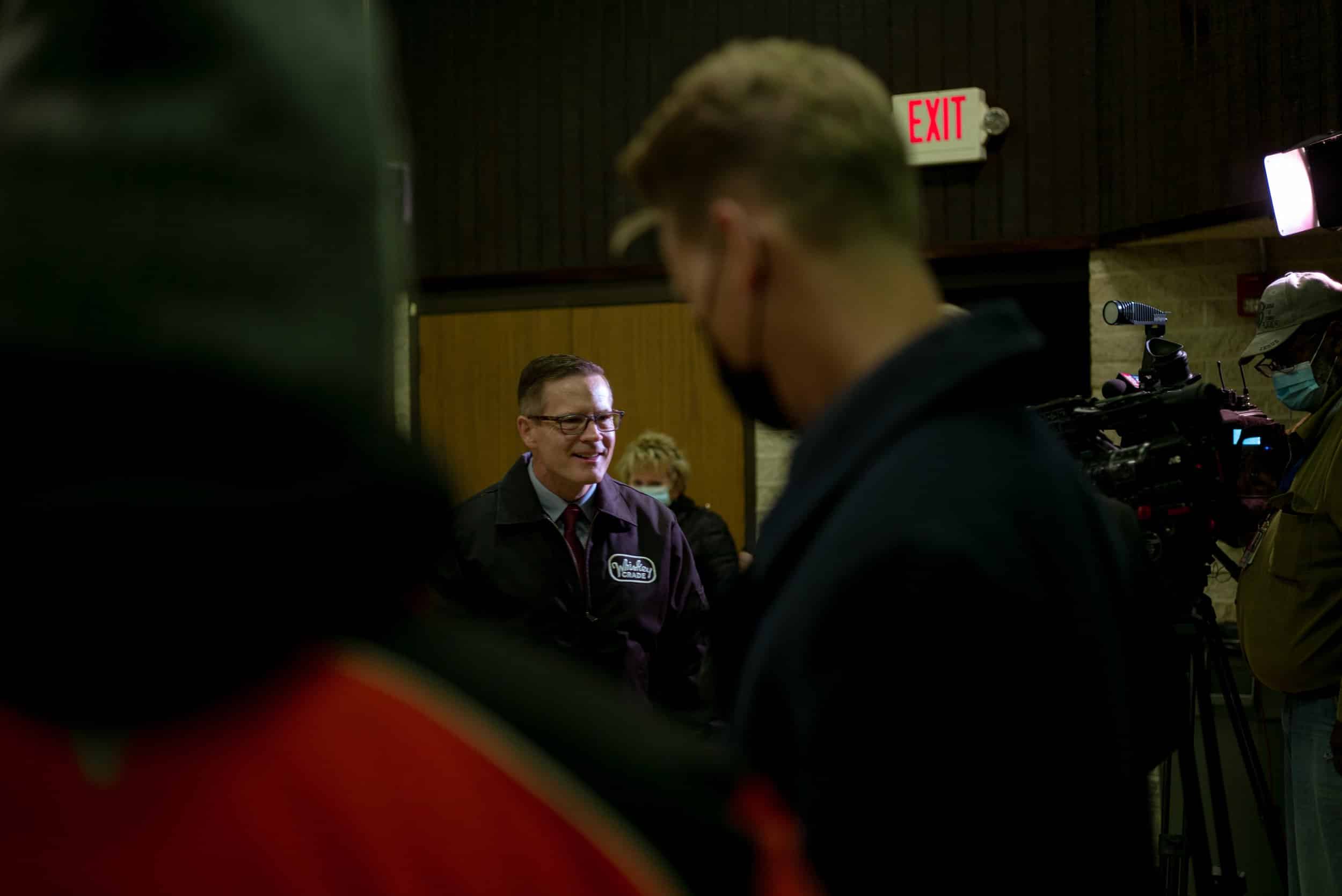A passerby interrupted Mayoral Candidate Kevin Kelley with an emphatic “Go Bibb” while he was giving interviews to media outside the polling station at St. Thomas More Church in Brooklyn, where he had just cast his vote, on General Election Day on Tuesday, Nov. 2, 2021. Photo by Michael Indriolo