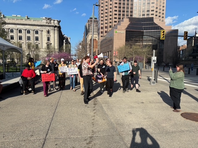 This past Monday, about 40 people gathered at Public Square in downtown Cleveland to protest the cuts and call on RTA to pass a levy. With loud chants of “Fund transit now!” and “What do we want? Public transit! When do we want it? Now!” They marched, carrying signs and a model of an RTA bus on a stretcher, to a public hearing at the RTA headquarters on W. 6th St.