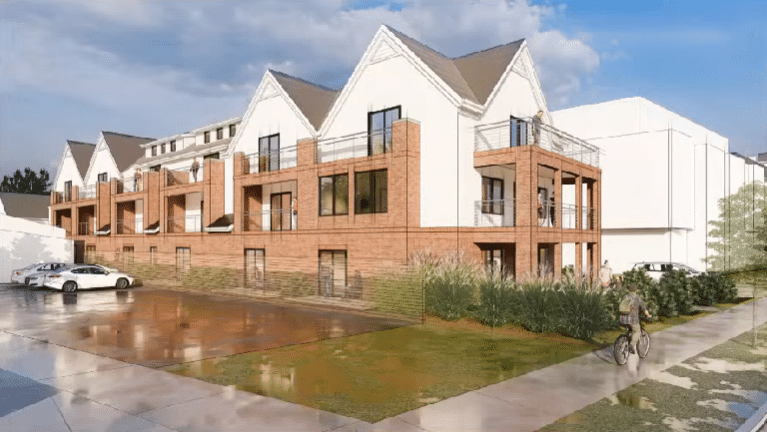 The design of the proposed building would include a brick facade, front porches, and balconies, and 15 parking spaces for 14 units, plans show. The driveway would be tucked behind the building facing Baricelli Apartments, a 44-unit apartment building that rankled some residents who thought it was too dense and modern when it was approved by the landmarks commission in 2019.