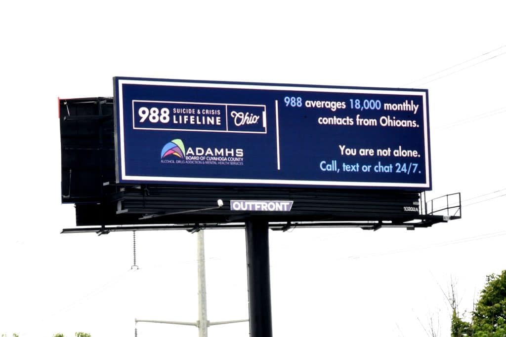 The Alcohol, Drug Addiction and Mental Health Services (ADAMHS) Board of Cuyahoga County is promoting the 988 Suicide & Crisis Lifeline on 10 electronic billboards throughout the county. The billboard initiative started in mid-May, which was Mental Health Awareness Month, and will continue through the end of June.