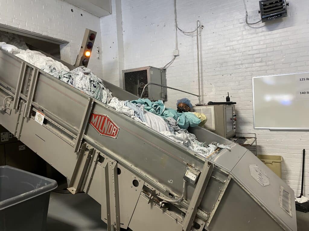 Employee-owner Catherine Pullen, who goes by “Miss Cat,” has worked at the laundry for five years and said she loves it. “I like the job, I like the people I work with,” she said. “Being an employee-owner is a real good thing, because you’re part of something bigger. And you get a bonus, and that’s a good thing, too.”