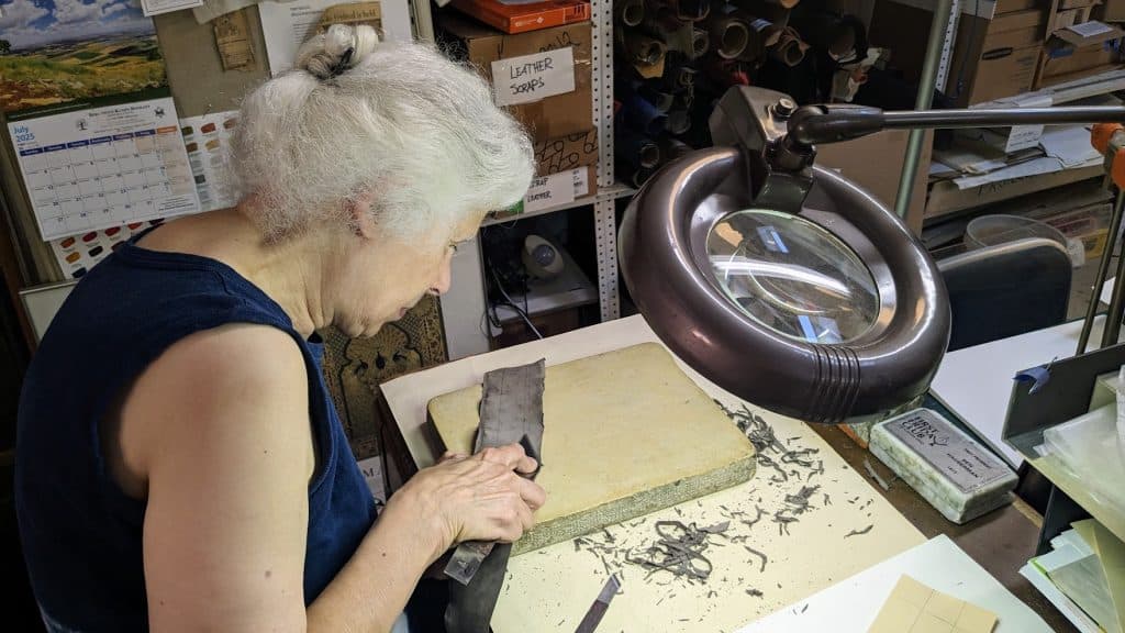 For local customer Ron Kisner, Strong has put leather bindings on new books and repaired a tattered Bible given him by his parents for Christmas in 1955. Kisner says, “When you walk into her space, it’s like you’re going back in time. It’s almost like a curiosity shop. It’s so hard to find people with the skill she has. Milliners, hatmakers, bootmakers are all gone. She’s working away, doing amazing things. These books are coming to life again.”