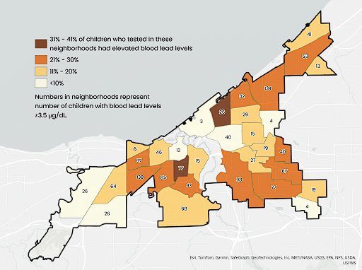 Over 90 percent of Cleveland’s standing homes first sold or rented to their initial tenants prior to the 1978 federal ban on lead paint, meaning interior walls would have received at least one coat of potentially toxic paint. The subsequent four decades saw the loss of population and the more recent influx in absentee landlords.