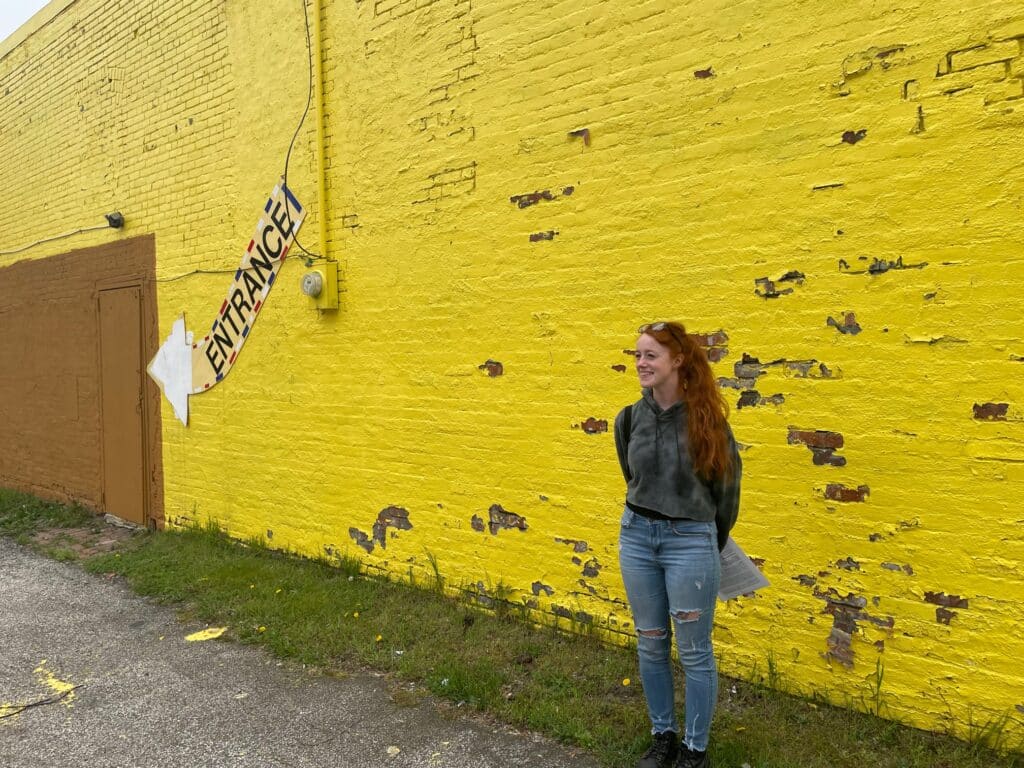 After attending Lakeland Community College for graphic design and getting involved in the art scene in Cleveland, LeBaron began painting murals locally. One day, she was driving along W. 25th St. with her boyfriend, artist and writer Shawn Mishak, and they both spotted an ugly, peeling, blank wall that they thought could use some brightening up. Facing a large empty lot, the brick wall was painted canary yellow with a muddy brown rectangular splotch in one corner.