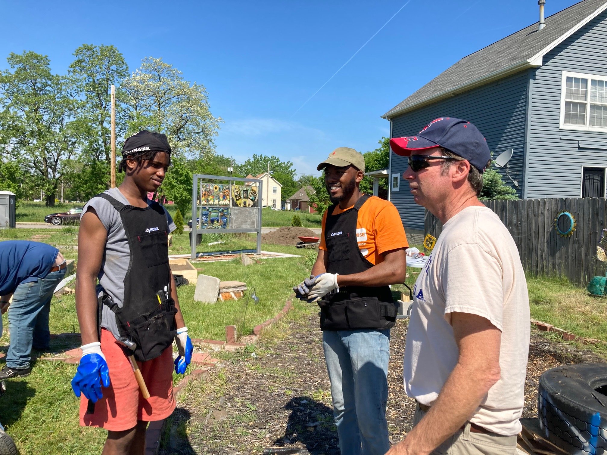 Demetrius Carter (center) with a student from East Technical High School and a teacher from Max Hayes High School developing a garden.