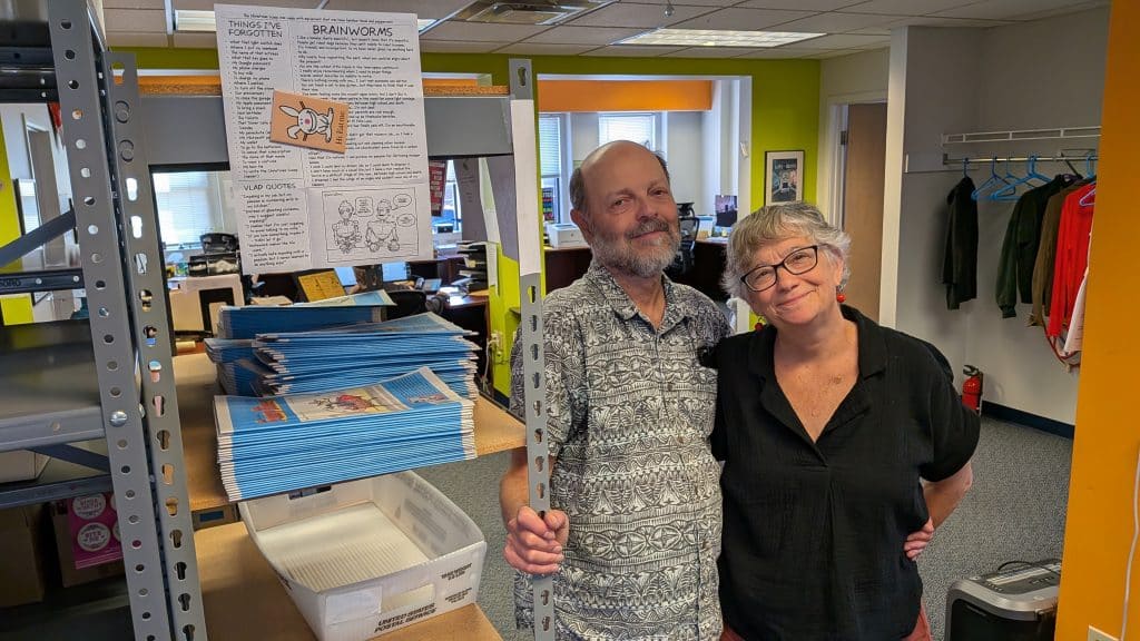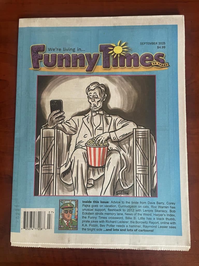 How long will the Funny Times continue? The founders worry not just about censorship’s rise and journalism’s decline, especially in print, but about artificial intelligence. Wolpert says, “They’re stealing the work of cartoonists, the style and the content. No credit. No payment.” Whatever the future holds, though, “We’ve had a great run.”
