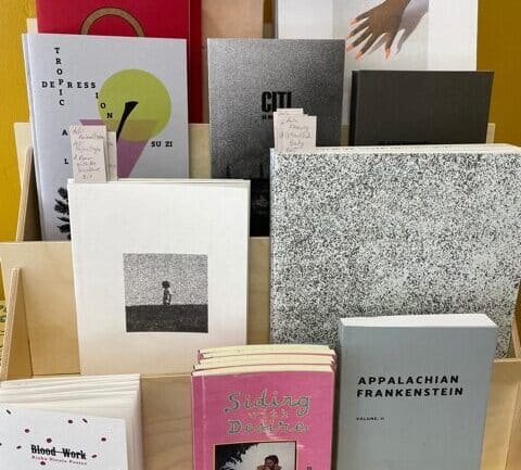 The tiny but well-planned space is a “shop local” maven’s dream: on the left is a table replete with vintage, reusable fabric bags for shopping, arty small publications, and zines with titles like Kriminal Kinks, Fever Schemes, and Space Creators. Later I found out that these chapbooks and such were from Imprint Arts Collective next door.