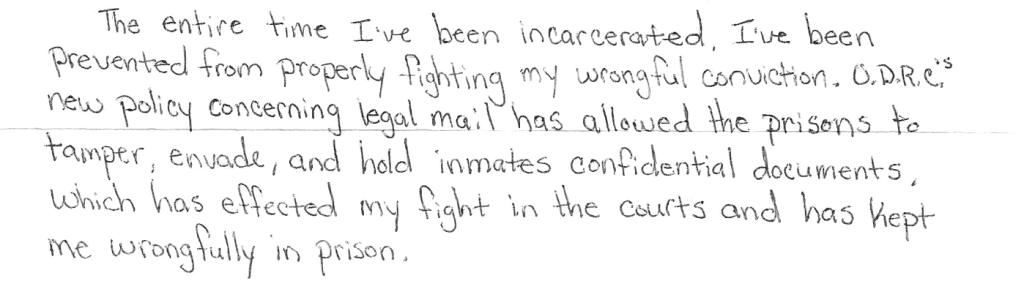 “All they do is lie to us, and spin us,” said Jason Monaco, an incarcerated man who works in the law library at Noble Correctional Institution, where he helps others, like Bishop, fight for their mail. “These people do not care about the Constitution or anything it stands for.”