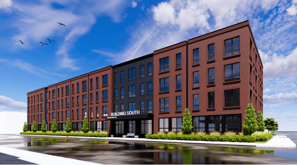 The 56,000-square-foot rectangular south building will contain 58 apartments and one parking garage but no retail space.
