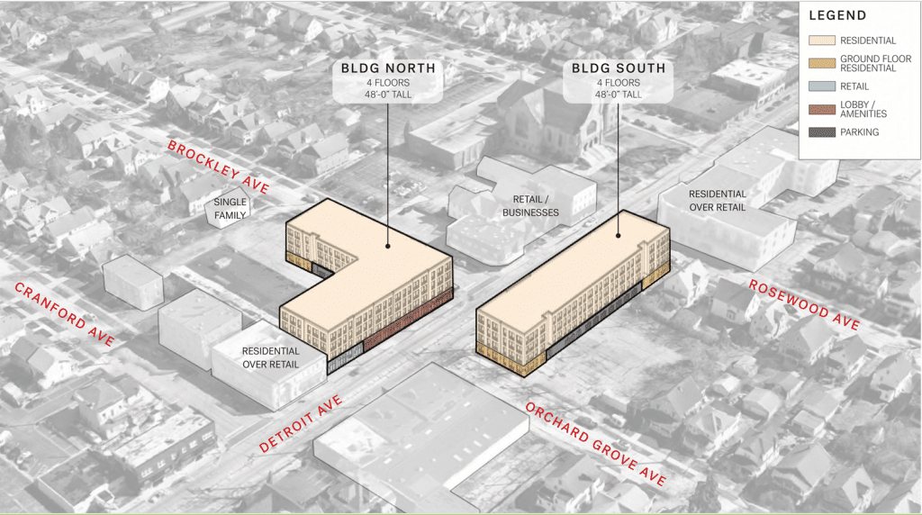 One building will stand off the north side of Detroit between Brockley and Cranford avenues. The second building is planned for the south side of Detroit across from Brockley.