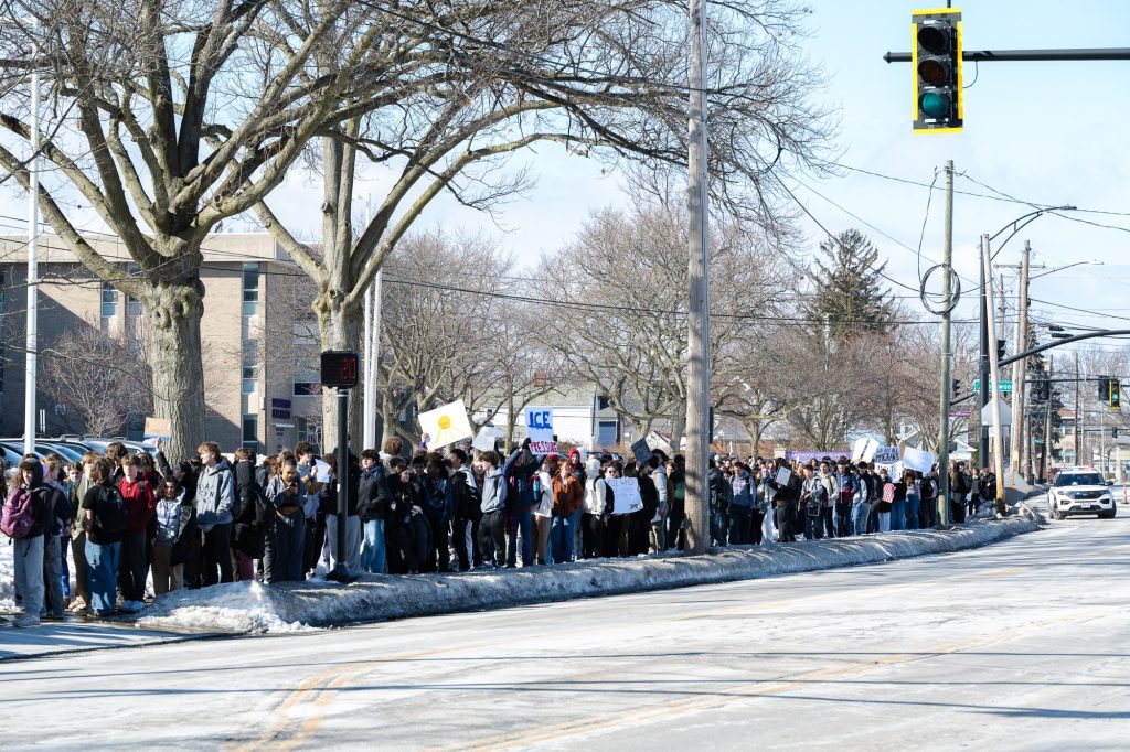 Many students held signs with slogans such as, “Abolish ICE”, “No one is illegal on stolen land”, and “Liberty and Justice for All”, while marching from the school entrance on Hilliard Road down Bunts Road in Lakewood.