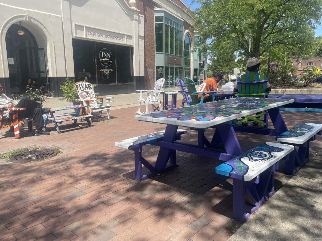 And that yielded the initial priorities we had for the first year, 2023, which were: places to sit, shade and public art. Those were the top three things people had said. And that informed what we focused on that year. So as you know, we worked with a lot of folks, a lot of business owners, and artists who were from the neighborhood, to execute that the first year. And the two artists who did the furniture and the canopy are both from the PEACE Campus, and a lot of the paint and materials came from Ace, so we were really trying to spend that money on Coventry, and within Northeast Ohio, and the furniture came from the Amish furniture makers from Ohio as well. So that was really cool. We’re kind of going out of order, but we fundraised that money through an Ioby campaign, which is basically a fundraising platform for community groups. And, we leveraged some of the Cuyahoga Arts & Culture matching funds, that was great that helped us sort of fundraise more quickly than we could have otherwise. I think we fundraised from about 80 individuals donors, some of the bigger donors were folks who own businesses on the street. So you can see the buy-in from that perspective as well.
