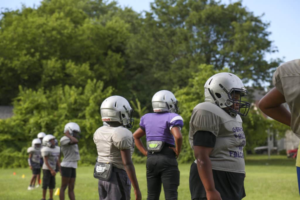 Surrounding the four teenagers are about a hundred Garden Valley Falcons, aged 6 to 14, many just a week into their newly ordered pads or purple-and-white jerseys. Today, they sprint through pass plays, crisscross around circle cones in the grass.