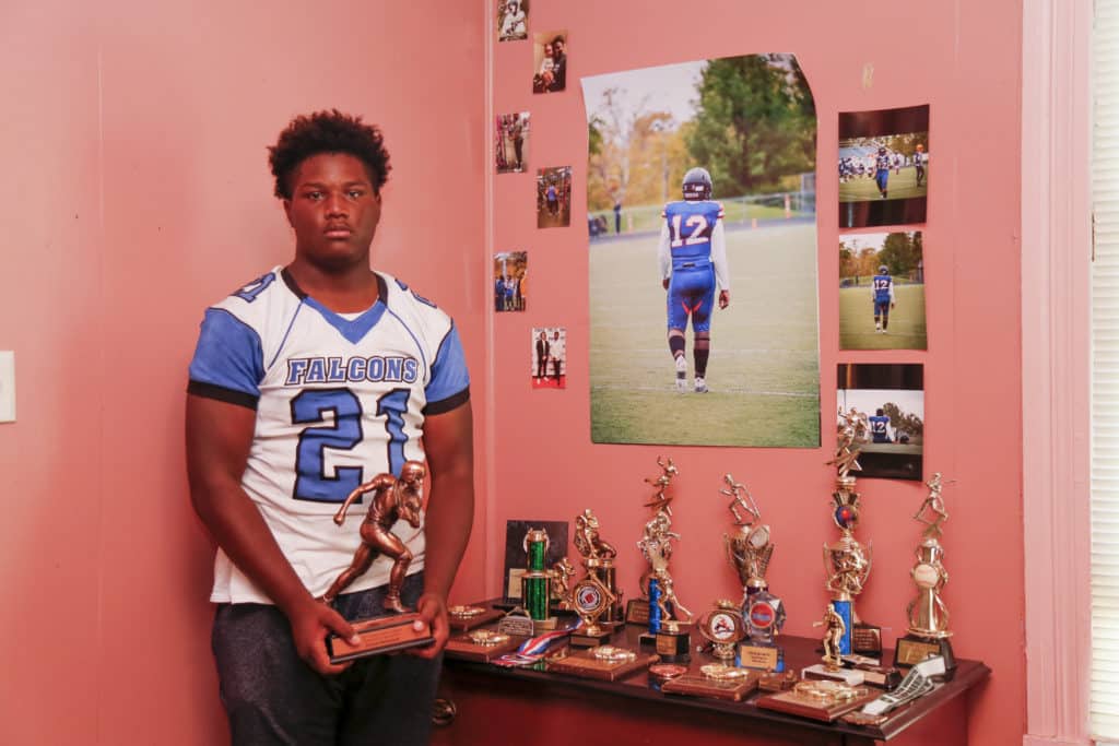 Today, as a sophomore at at Lutheran East High School, Denzel brims with youthful optimism. He said he’s spoken with a few college officials, even taken advice from Browns wide receiver Odell Beckham, Jr. He envisions making drives for Ohio State – or Oregon, maybe. Standing tall in front of his trophy dresser and a 4-foot-tall action photo of himself in his bedroom, Denzel doesn’t mind gloating. “I’m expecting some offers after this season.”