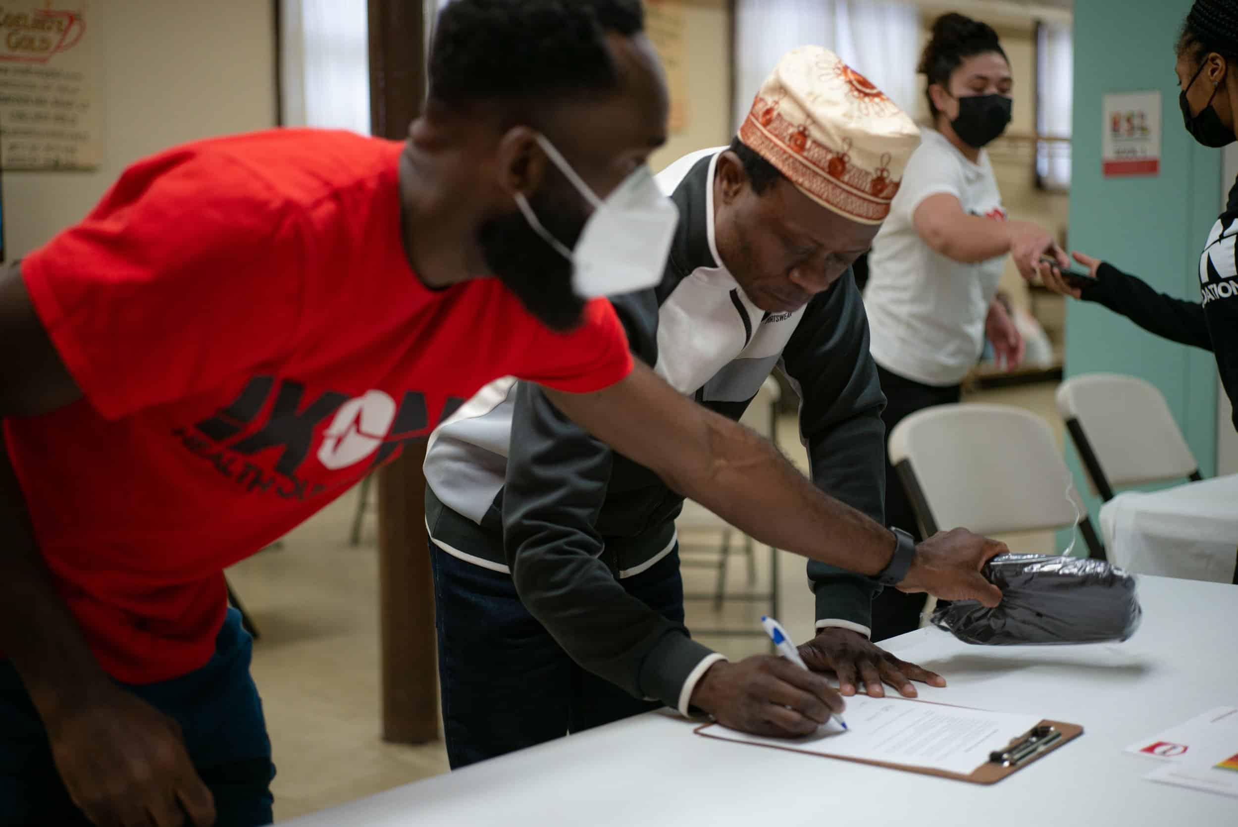 Ikenna Ogwuegbu helps Congolese Refugee Elijah Kidjana sign in for health screenings. Kidjana’s journey to America took years, he said. Decades of war in the Democratic Republic of the Congo forced him from his home in the city of Kisangani. He moved to another city, Goma, but, “war found me in Goma,” he said. He left Congo in 2008.
