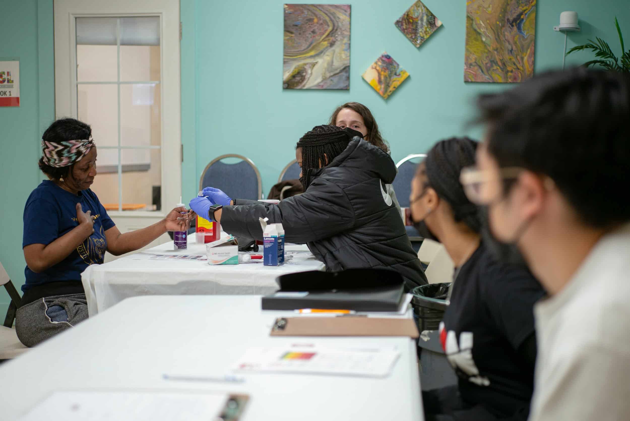 IKON secretary Mariah Carlton tests the blood sugar of Congolese refugee Inette Masika, Kidjana’s wife.