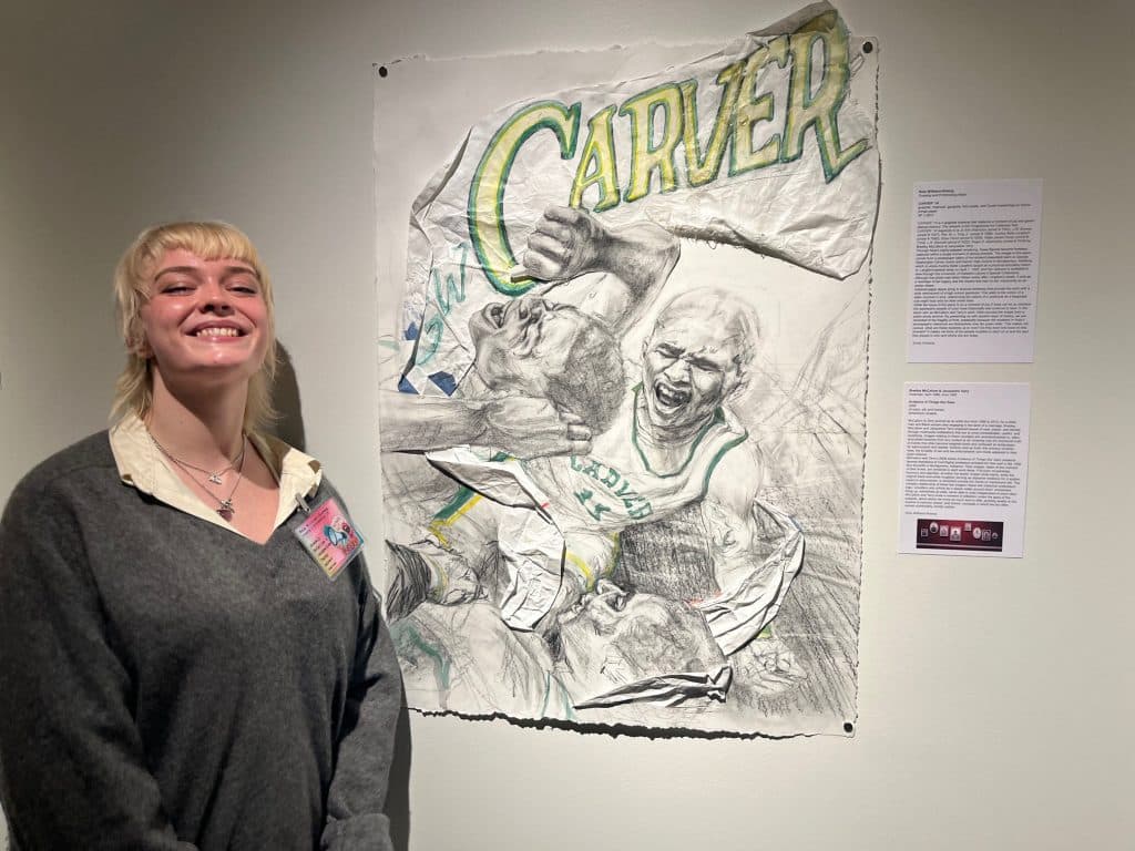 “The artwork I’m responding to is called Trophy Member,” Bruno said. “I worked with Todd Pavlisko, the artist behind the piece that hangs inside Progressive. The goal is for students to respond to the artist’s work in a way to celebrate it. And then have conversations with them to get more inspiration and insight on the artwork. Pavlisko’s piece is a case of trophies. The trophies have names of art patrons who supported either the artist’s practice or the Progressive Art Collection. So, as a person who draws, sculptural work was a different direction for me. Pavlisko helped keep my fears regarding sculptural art intact by further explaining its conceptual idea.”