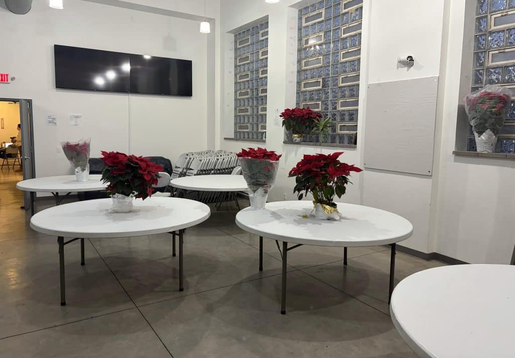 As homeless shelters go, the (now clean) location is a gem. The nonprofit owns the building, which boasts a massive dining and kitchen area with space for approximately 10 tables, and seating to accommodate around six people at each table. A long kitchen island is set up to prepare food or serve as a buffet for prepared dishes. A large TV is mounted on a freshly painted white wall in the dining area. Food can be prepared at the location, but it’s mostly donated by organizations and individuals.