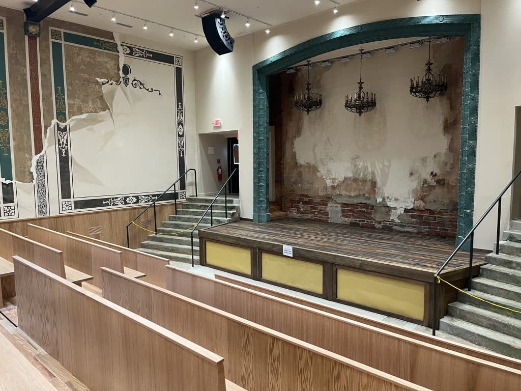 The hardwood floor of the stage was refinished by Cleveland Hardwood Restoration. Audience seating can hold 150 people. Murals around the stage were restored by the Cleveland Mural Company, making the original paintings more colorful while also embracing their age. Ferrante hopes to attract both local and national bands to perform on the renovated stage as well as host poetry readings, speakers and author events.