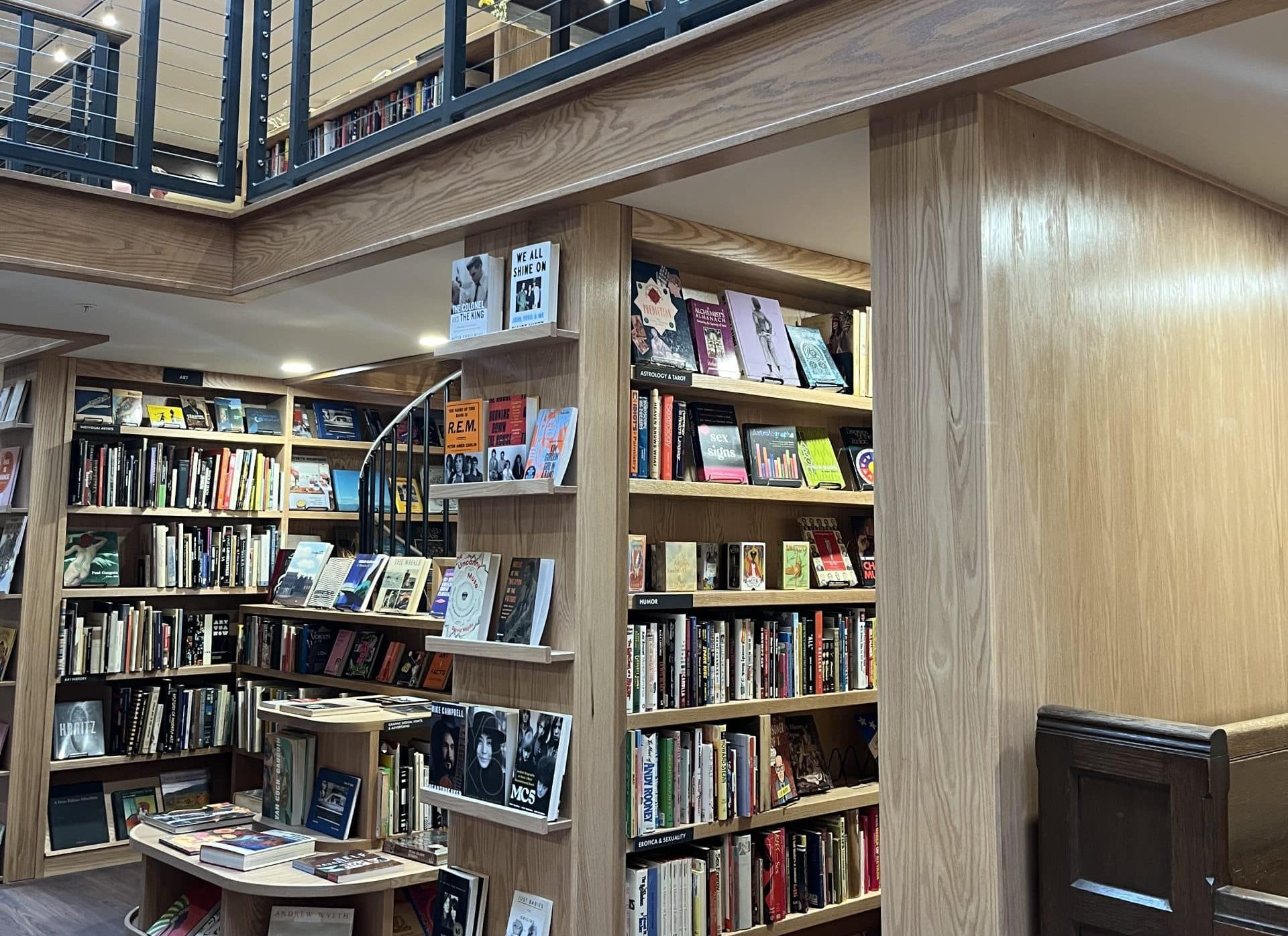 The new location offers cozy leather chairs upstairs in the Mezzanine area to sit and read or talk, as well as tables to spread out and work or study while eating a snack. The space is airy and open with lots of plants. The drop ceiling in the space was taken out and new skylights make the entire bookstore bright with its 25-foot ceilings.