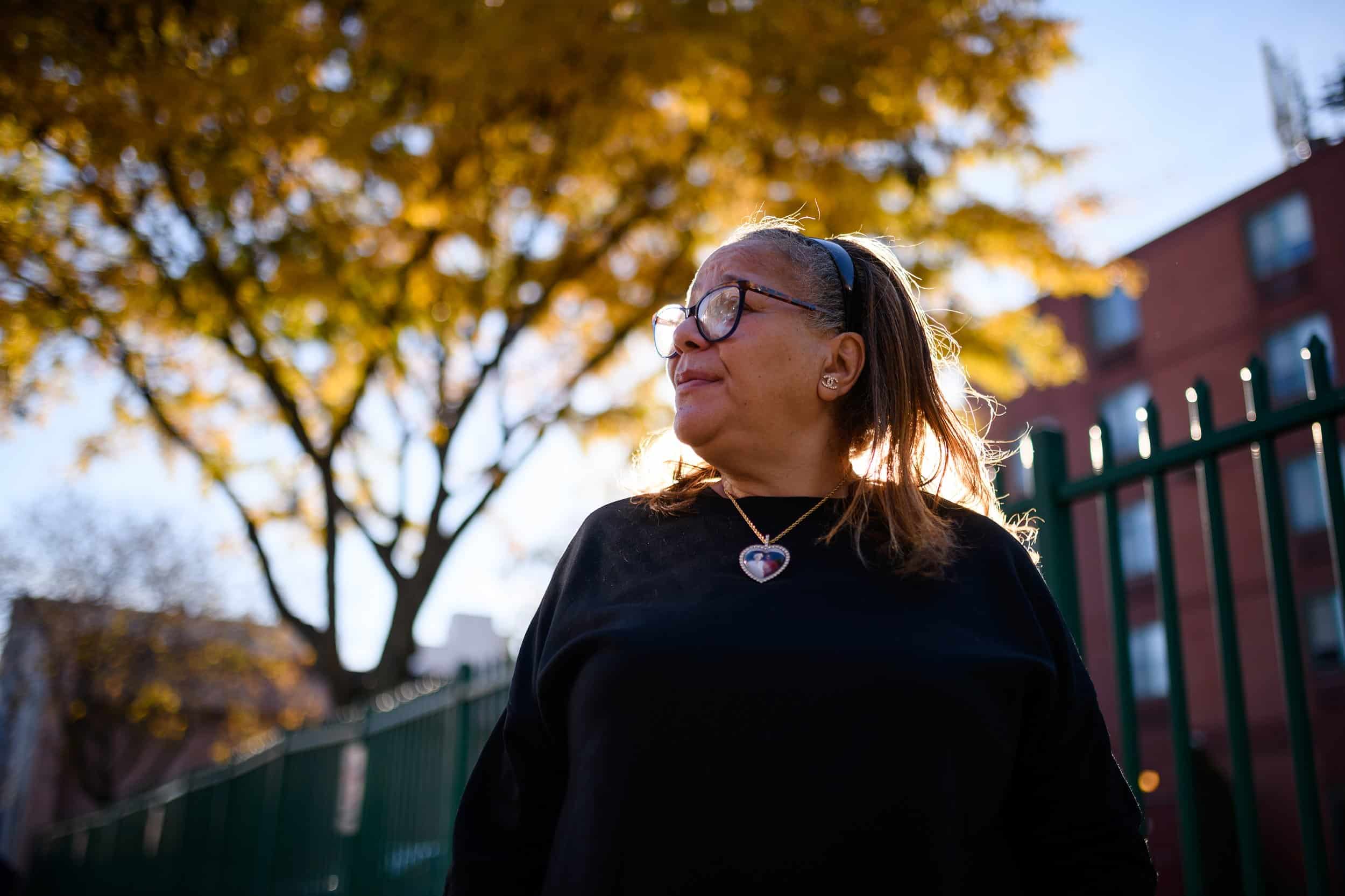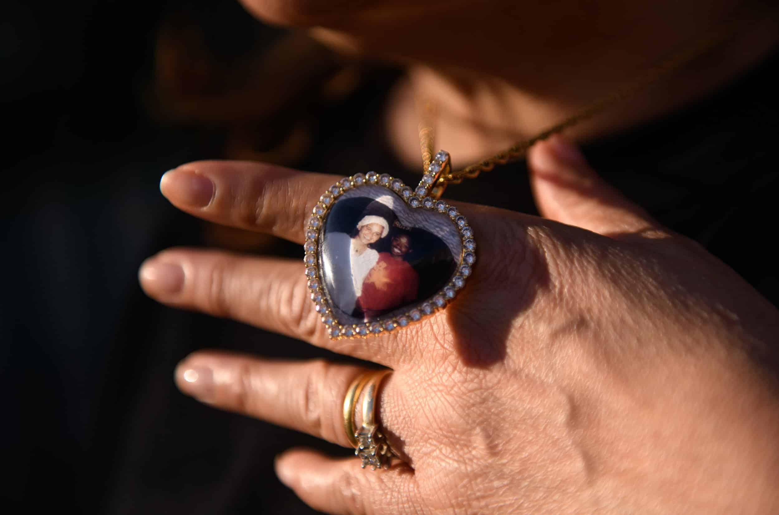 Kevina Chapolini holds up a necklace with a photo of herself and her husband down the street from her home in Philadelphia on Thursday, November 18, 2021. Her husband died last year following a battle with cancer, from which Chapolini is also a survivor. Photo by Kriston Jae Bethel