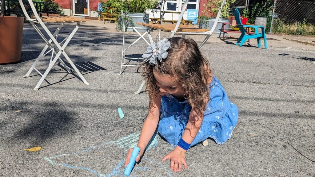 The sibling’s mom, Jessica Maron, watched them from an Adirondack chair in the street while sipping a cappuccino from the adjacent Rising Star. “We’re excited to have a public space for the kids to enjoy their hot chocolate,” she said.