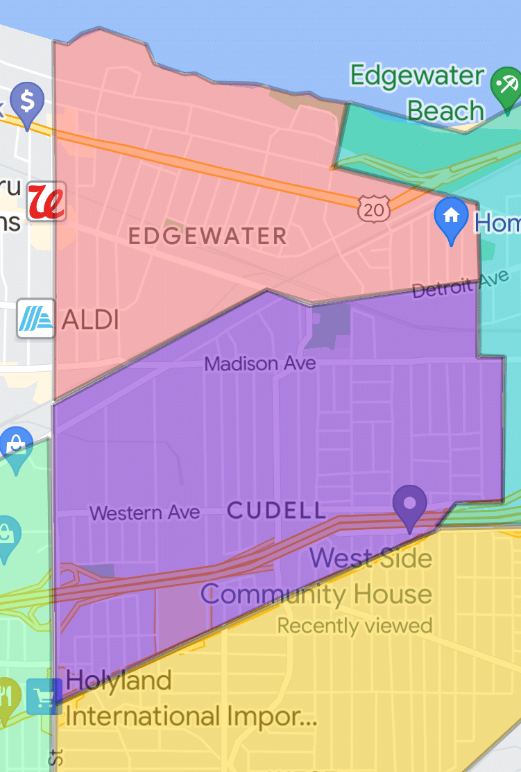 But what were we really? Neither Cudell nor Edgewater, according to the Encyclopedia of Cleveland History: Not the Cudell neighborhood because we’re north of Detroit Road, and not the Edgewater neighborhood because we’re south of the CSX railroad tracks.