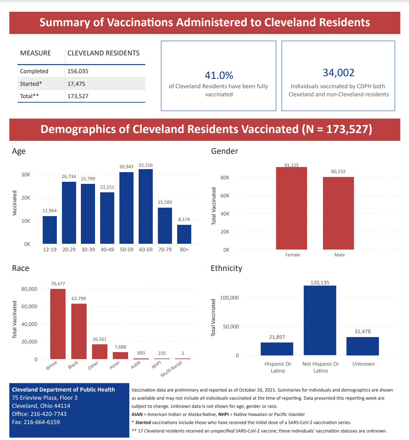 About 41 percent of Cleveland’s population has been fully vaccinated, according to data from the Cleveland Department of Public Health’s most recent surveillance report filed on Oct. 29. In Cuyahoga County, however, about 56 percent of the population has been fully vaccinated.