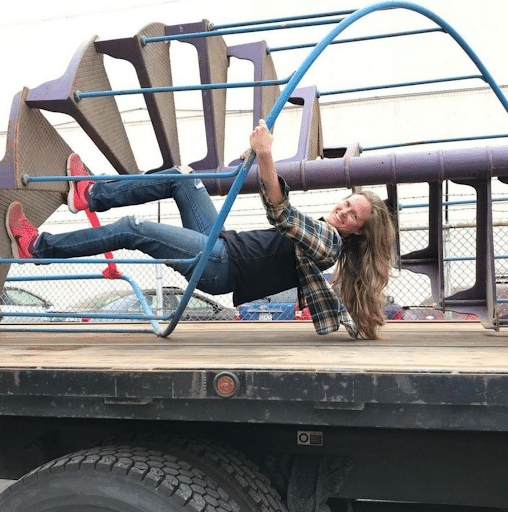 Jessica Davis of Rebuilders Xchange poses while unloading a salvaged staircase.